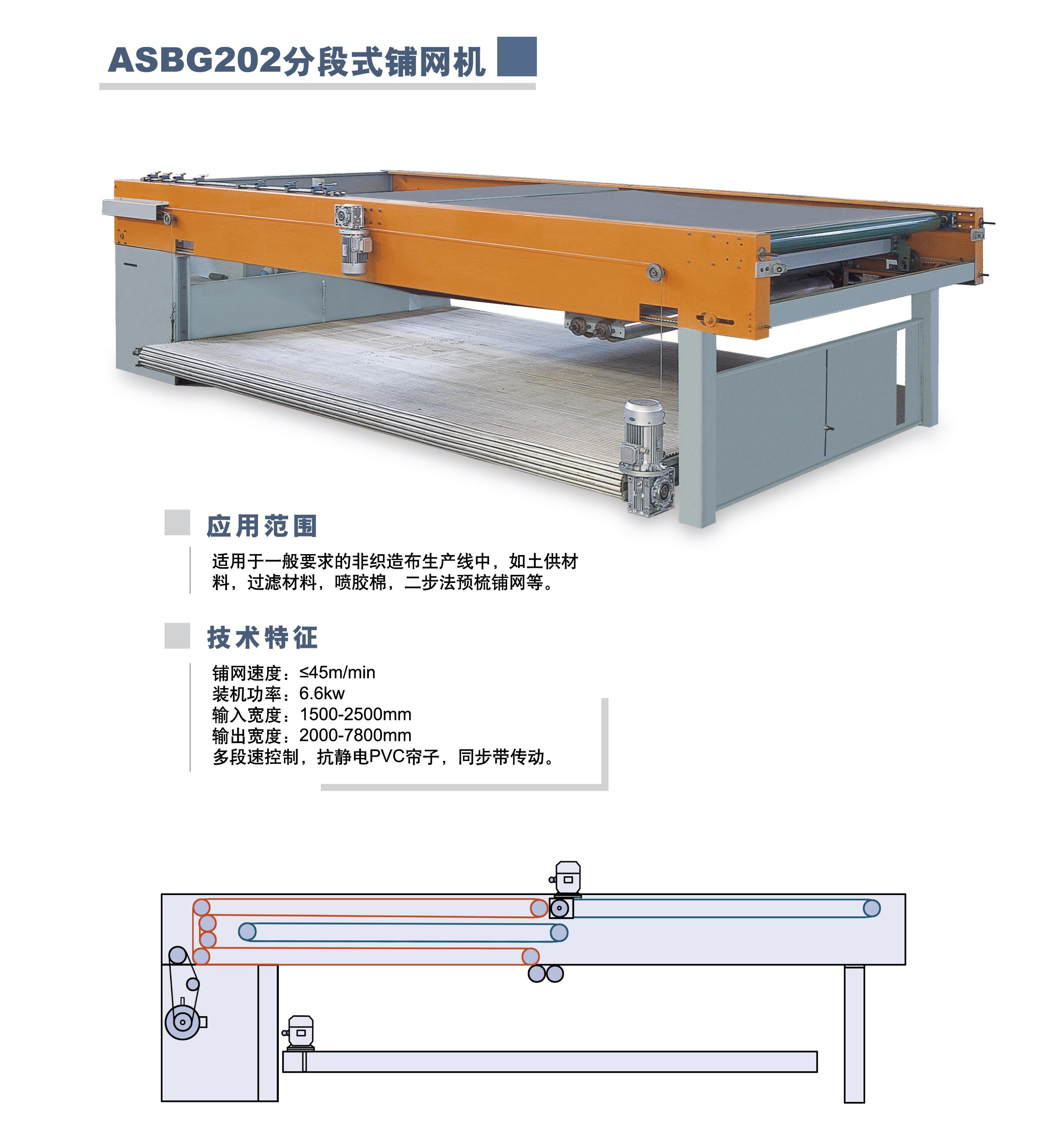 本機(jī)用于將梳理機(jī)輸出的纖網(wǎng)均勻折疊鋪成一定寬度及厚度的多層毛網(wǎng),供下道工序使用。
